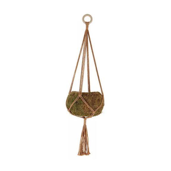 Macramé plant hanger, 71 cm. You can create a perfect atmosphere indoors with this modern and at the same time vintage-inspired plant holder. Thanks to its flexible material, the flower holder adapts to different sizes and shapes. Perfect, for example, for hanging kokedama, i.e. Japanese moss balls. With its help, we can keep our plants away from our pets, and we can even use it to free up space. The product does not include the kokedama ball.