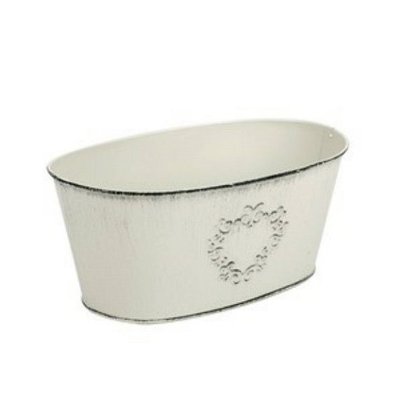 Tin, oval cup with a heart pattern on the front. Dimensions: 20.5 x 12.5 x 9 cm. Weight: 0.1 kg. Due to its size, it can be used to plant plants or make other decorations.